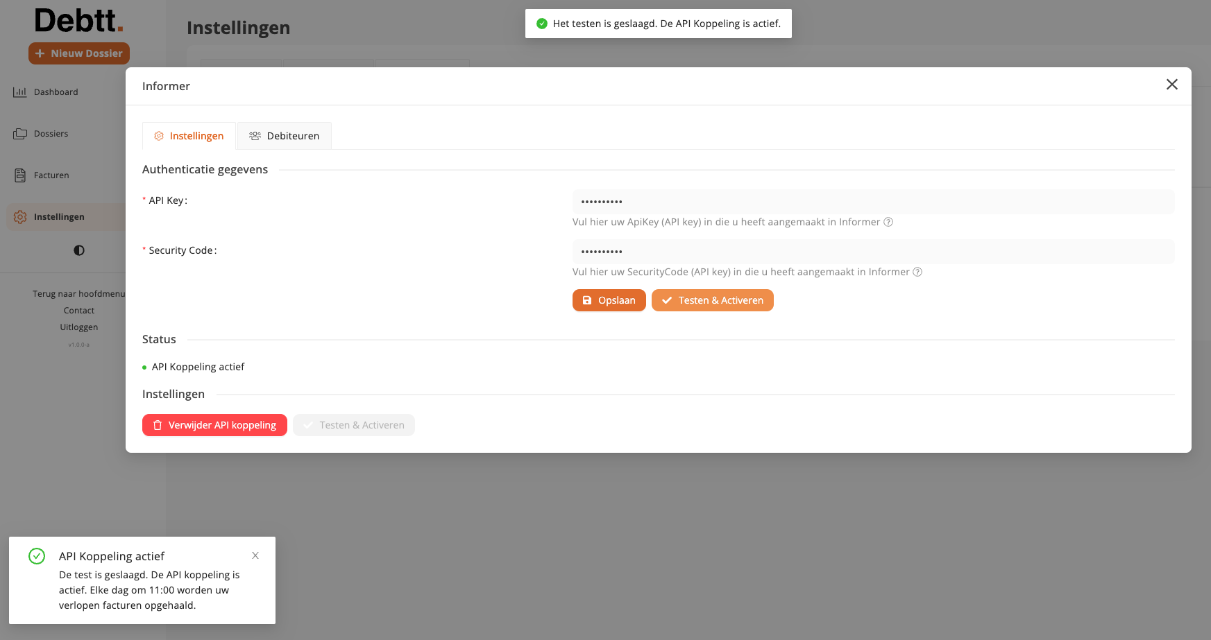 De koppeling is nu afgerond en Informer is gekoppeld. Wij halen elke dag om 11:00 de openstaande facturen op op. Een van onze medewerkers voert controles uit en zal een dossier voor u maken en in behandeling nemen