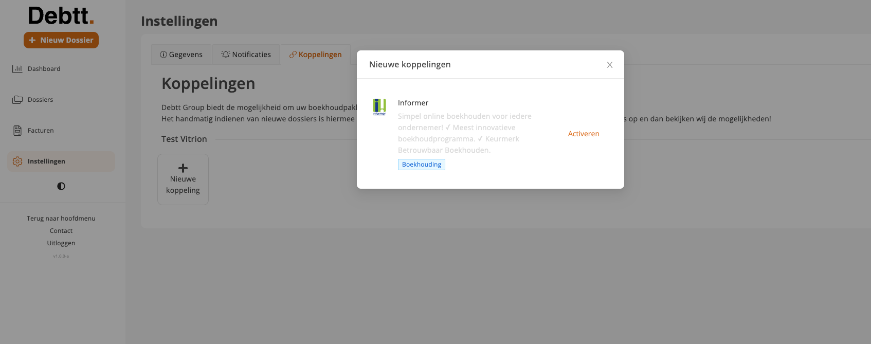 Klik op “Nieuwe Koppeling” bij het juiste bedrijf, activeer vervolgens de Informer koppeling