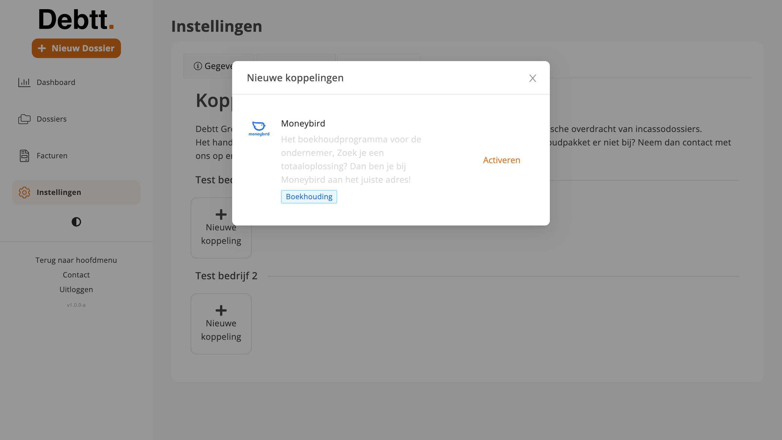 Klik op “Nieuwe Koppeling” bij het juiste bedrijf, activeer vervolgens de Moneybird koppeling