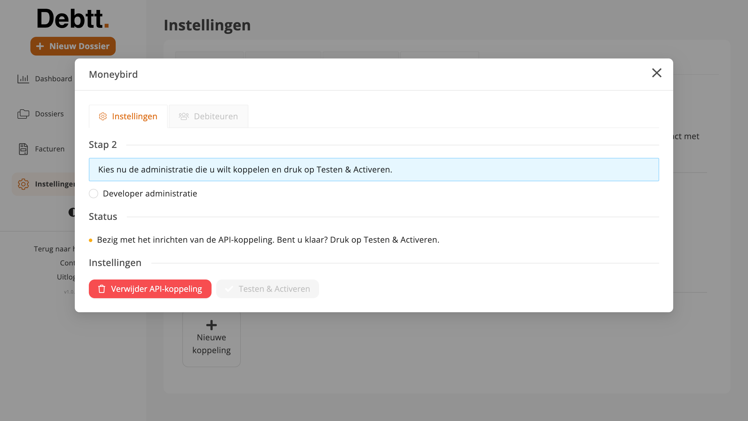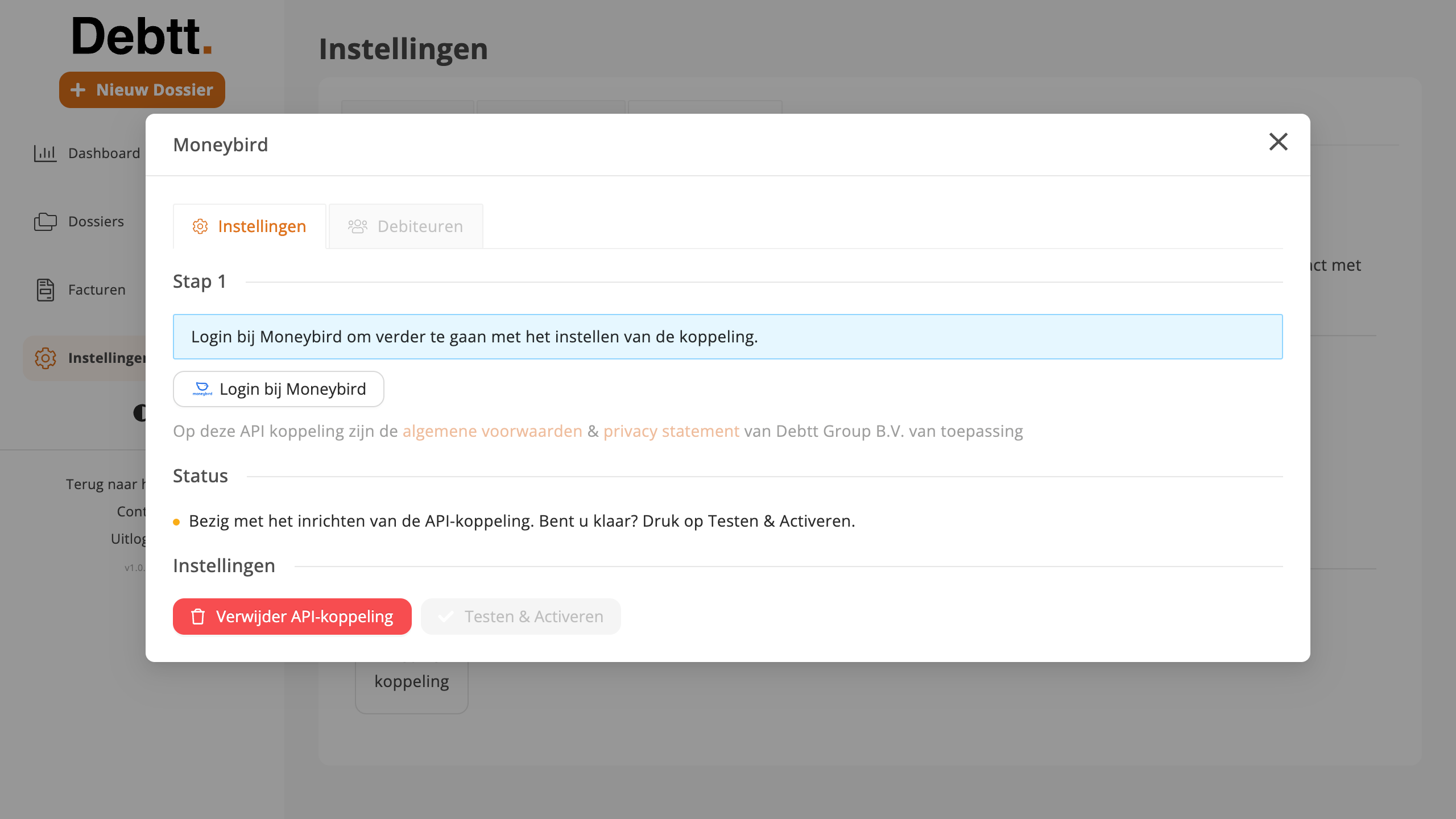 De koppeling met Debtt is eenvoudig in te stellen. Zorg dat u uw Moneybird gegevens bij de hand heeft.