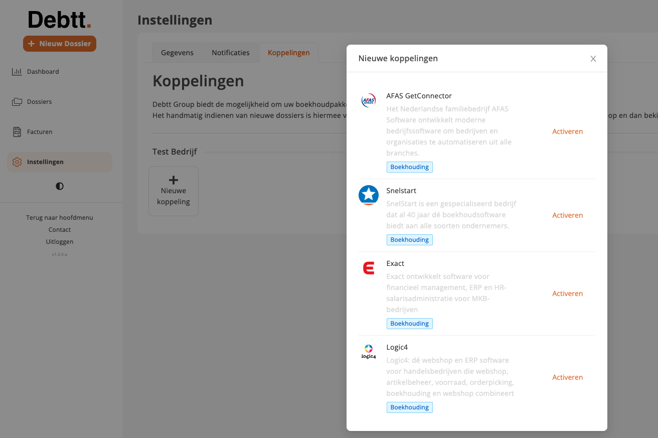 Klik op “Nieuwe Koppeling” bij het juiste bedrijf, activeer vervolgens de Snelstart koppeling