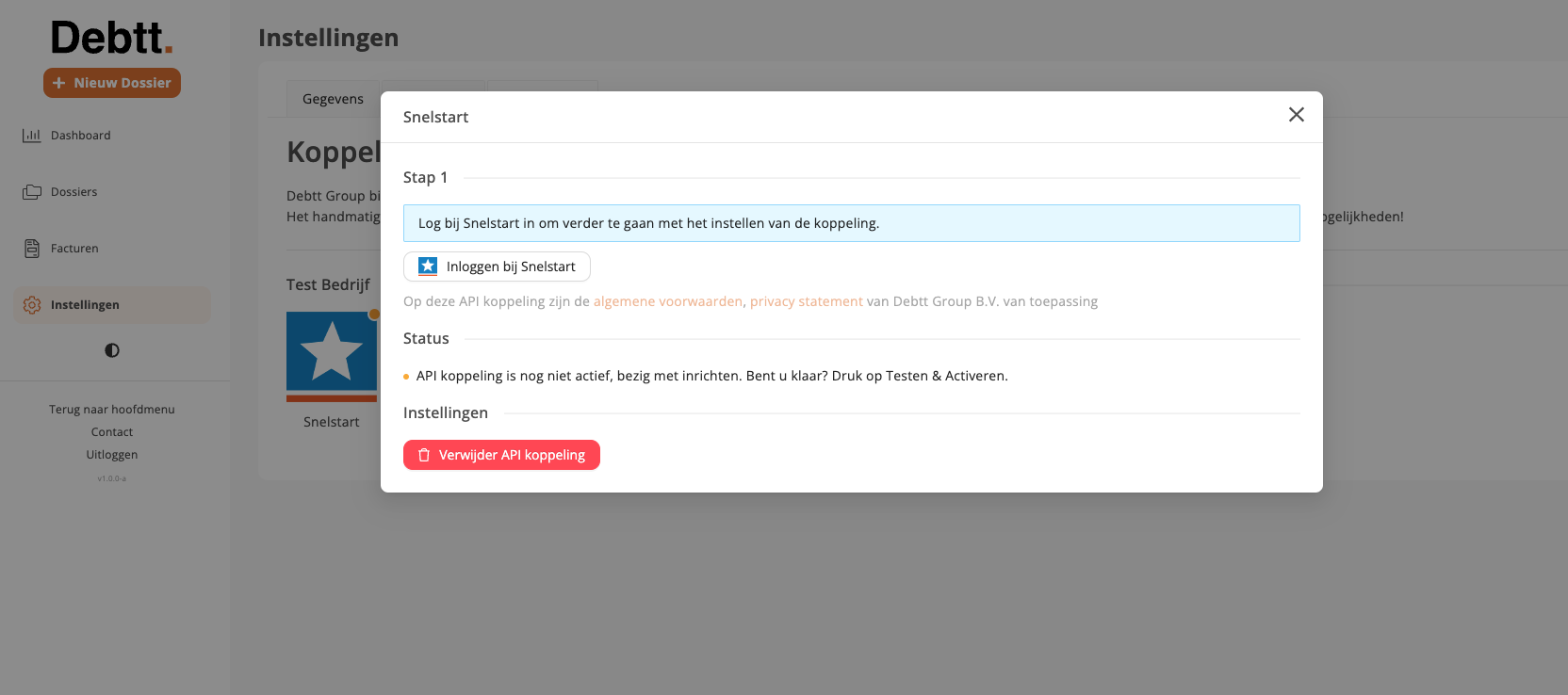 De koppeling is nu afgerond en SnelStart is gekoppeld. Wij halen elke dag om 11:00 de openstaande facturen op op. Een van onze medewerkers voert controles uit en zal een dossier voor u maken en in behandeling nemen
