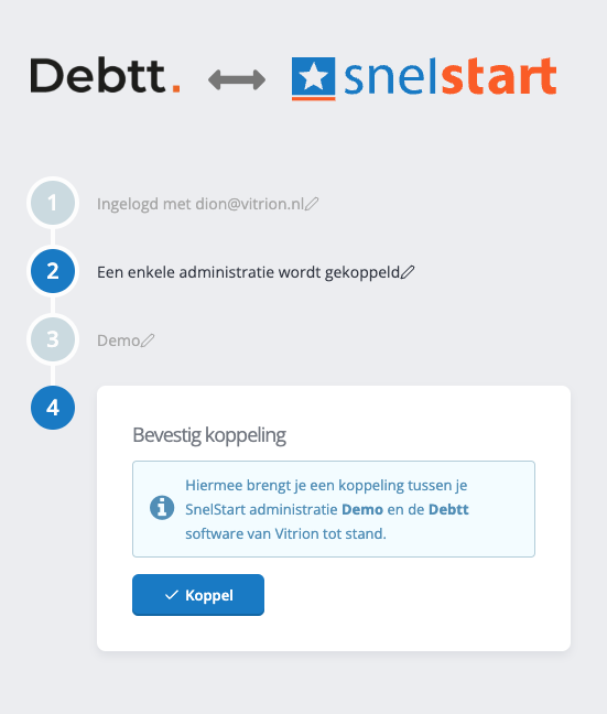 Vervolgens klikt u op “Koppel”, de koppeling word nu gemaakt. Dit kan soms even duren omdat alle openstaande facturen worden gecontroleerd.