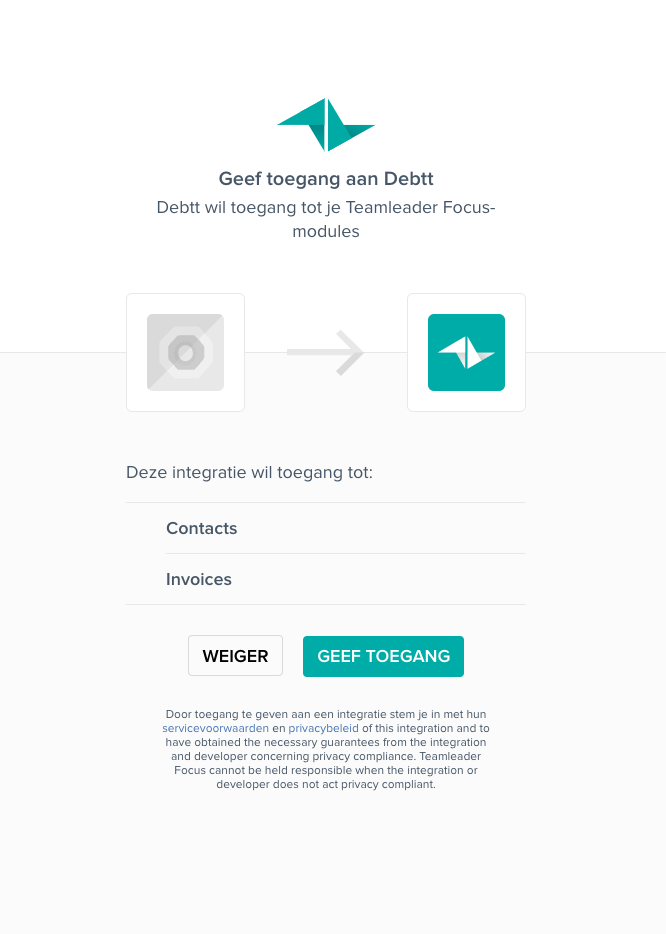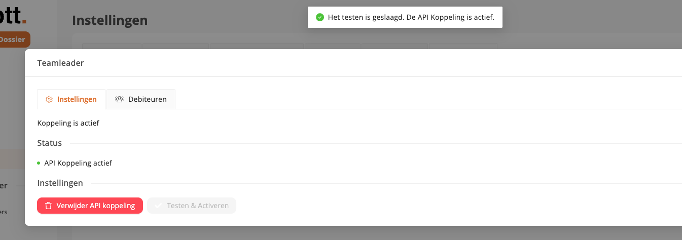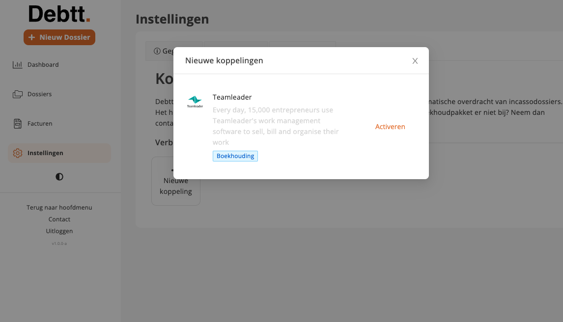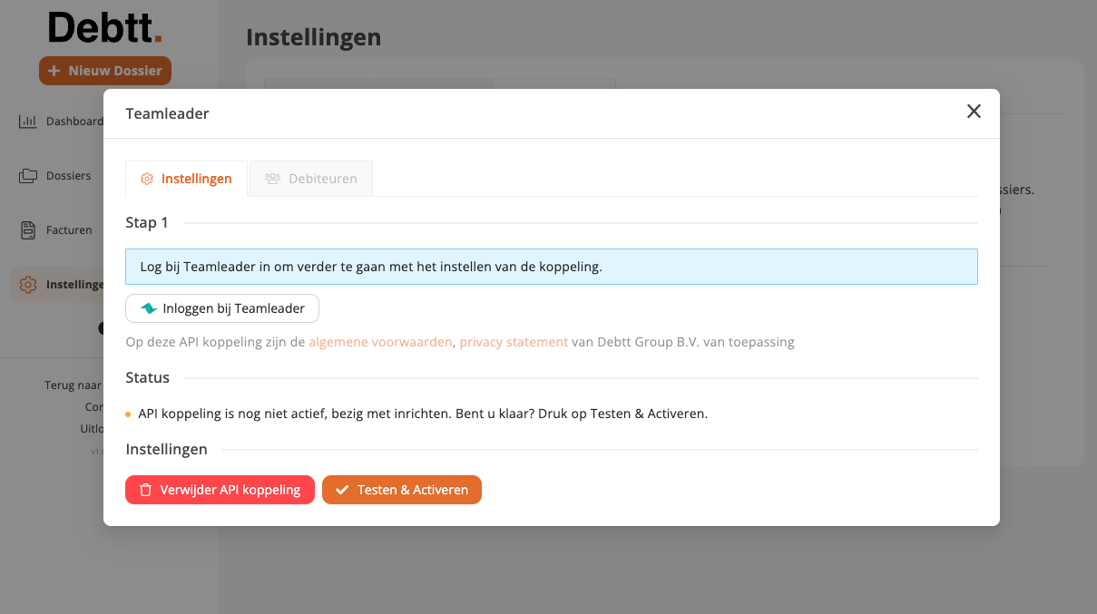 De koppeling met Debtt is eenvoudig in te stellen. Zorg dat u uw Teamleader gegevens bij de hand heeft.