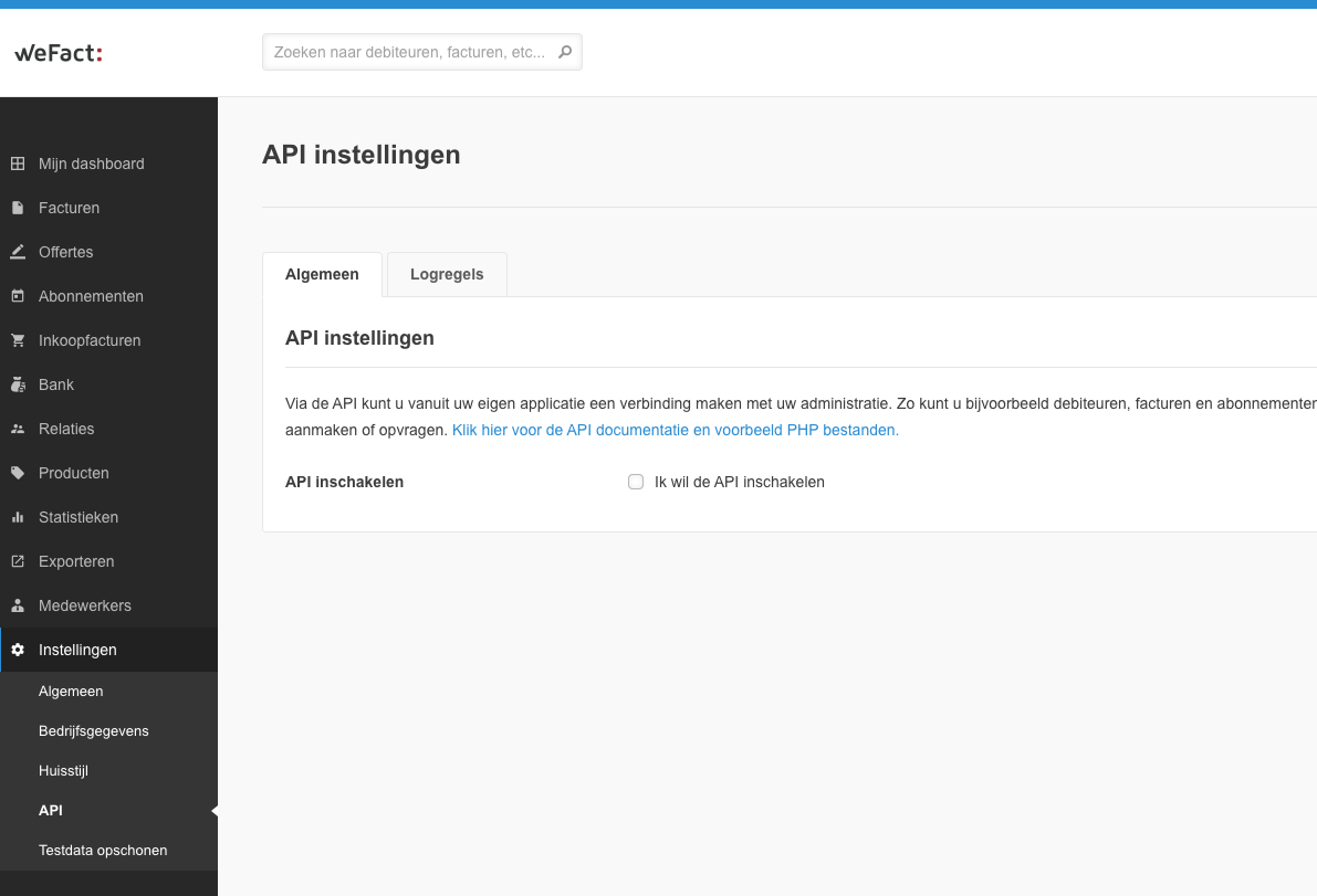 Wanneer u ingelogd bent in WeFact, ga naar instellingen -> API