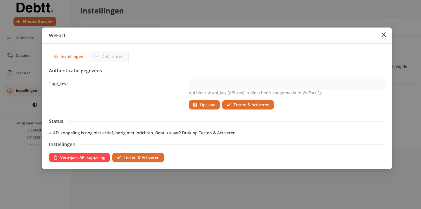 De koppeling is nu afgerond en WeFact is gekoppeld. Wij halen elke dag om 11:00 de openstaande facturen op op. Een van onze medewerkers voert controles uit en zal een dossier voor u maken en in behandeling nemen